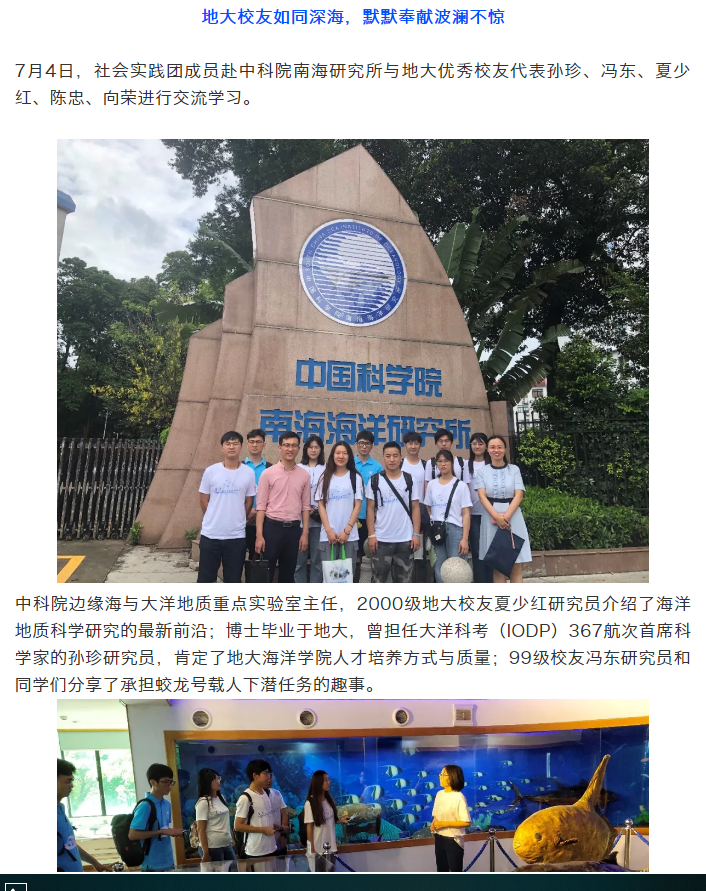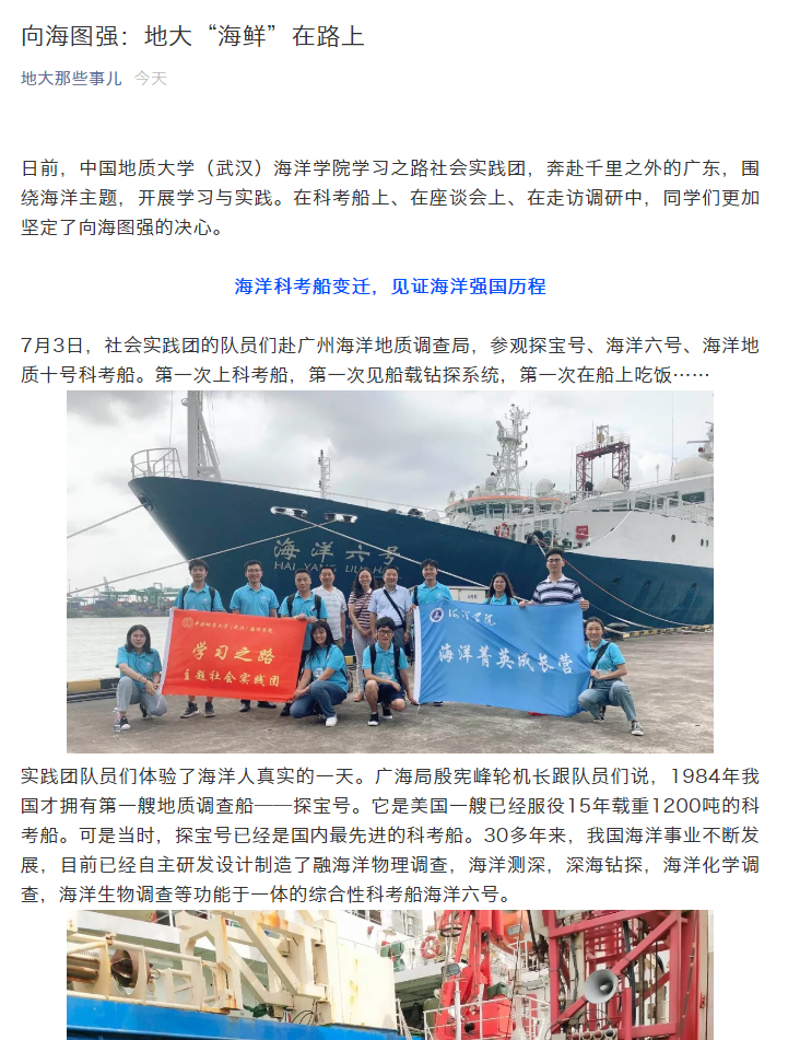 报道从“海洋科考船变迁,见证海洋强国历程”、“地大校友如同深海,默默奉献波澜不惊”、 “练就过硬专业本领,树立谋海济国之志”、“走进港珠澳大桥,找到奋斗的动力”四个专题部分对开云官网 “学海洋强国思想,践向海图强之路”的暑期社会实践活动进行详细的报道。