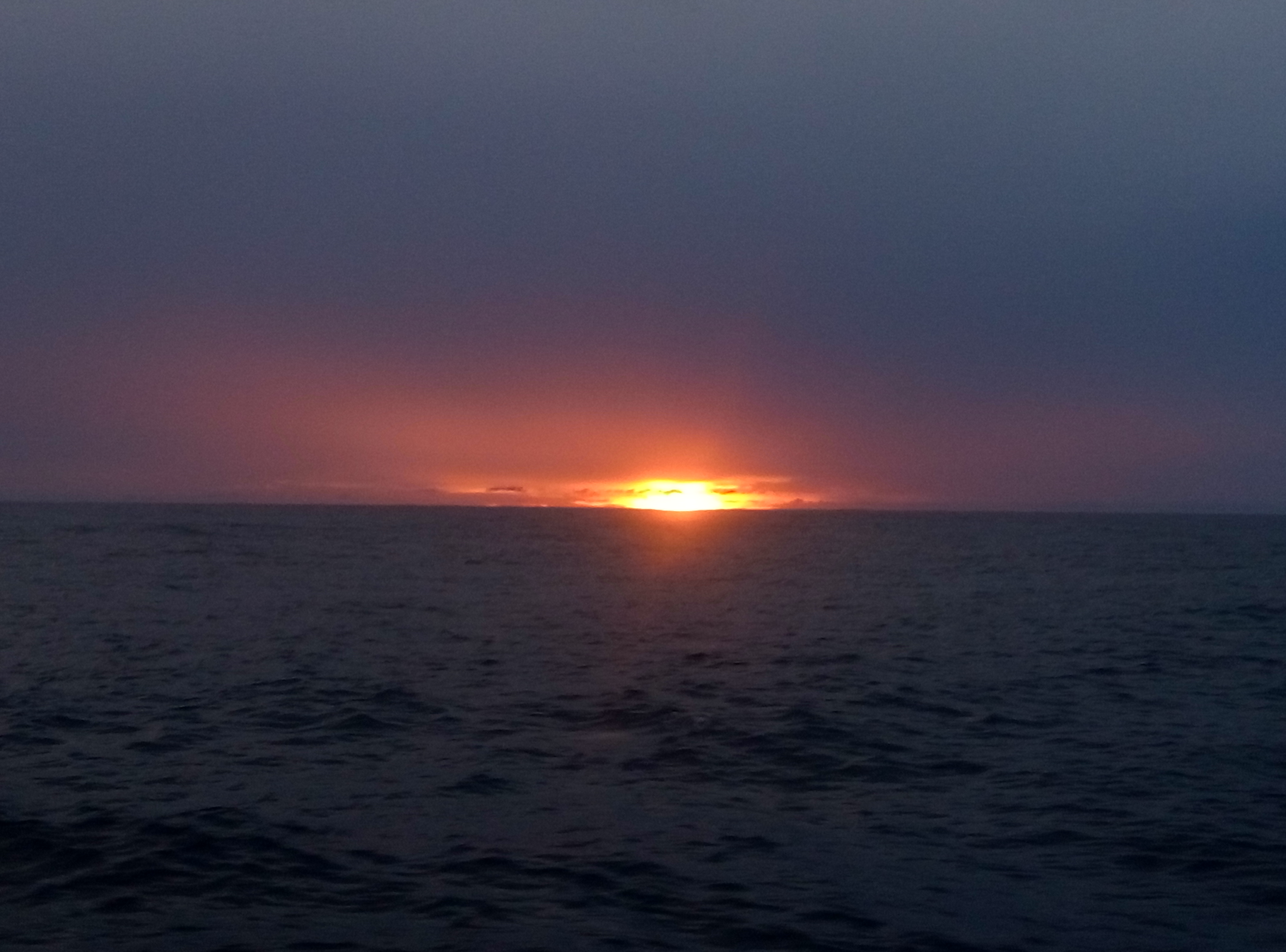 在这之后我们开始进入工作区域,正式进行了测量工作。当船到达南沙附近时,我看到了壮丽的海景,远处的海岛若隐若现,时而有一两艘渔船划过。傍晚时分,看着夕阳离海平面越来越近,远处的天空是红彤彤的,阳光穿过云层向四周散去,就如同被筛子筛过一样,一束束光线照耀在海面上,不那么耀眼,却又很温暖。这时一个大玉盘突然消失了,只留下一点光亮继续为我们指引方向。感觉海上落日十分快,你还没来得及细细品味她的美,她就害羞的躲进了大海的怀抱之中,不给你任何的机会。