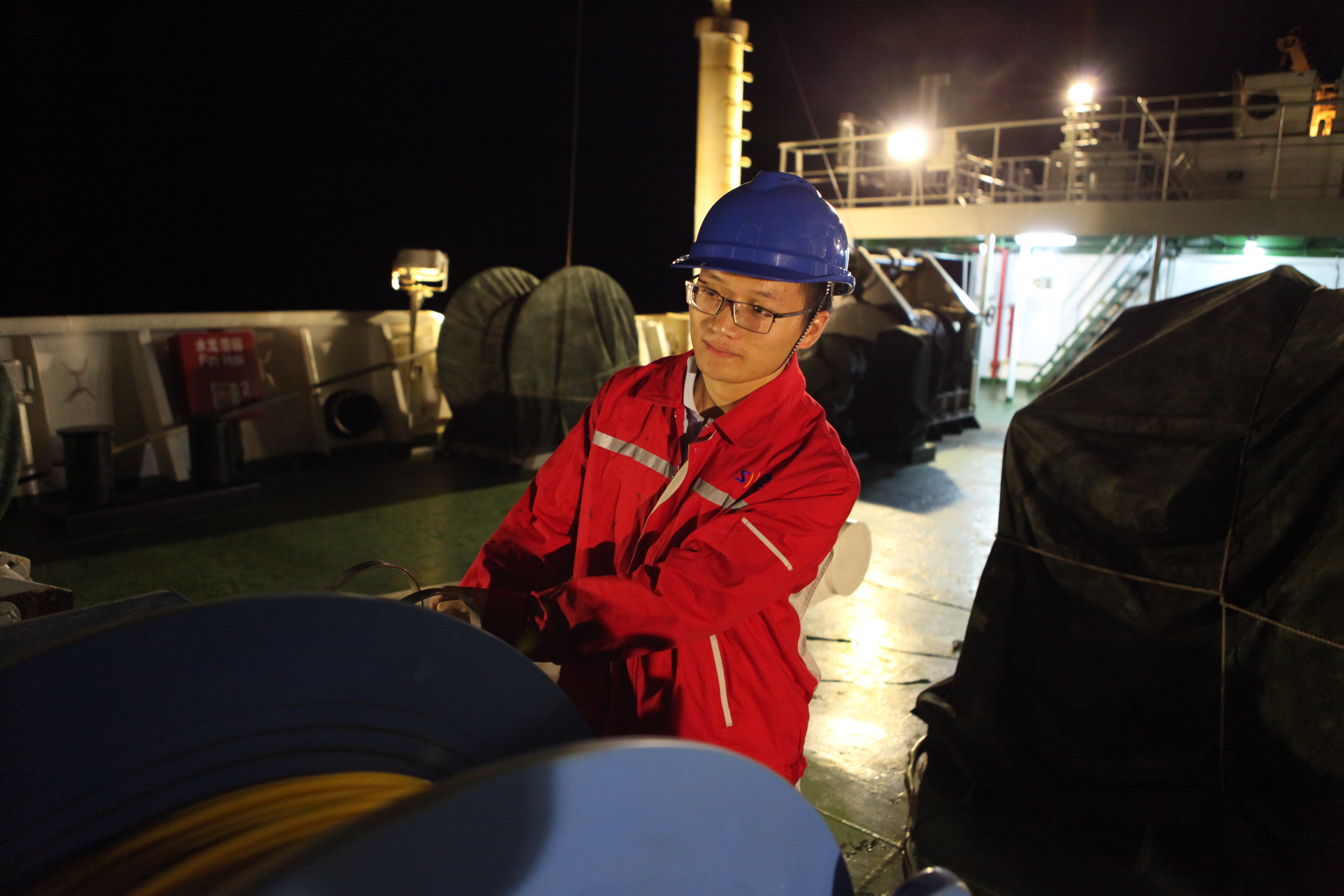 由于我们的任务时间比较紧张,所以我们船是24小时在不停的工作,我每天是晚上九点到凌晨两点值班,这使得我改变自己在学校的作息时间。第一天还真是不太适应,值班时就有点打瞌睡,后来经过慢慢的调整,我也适应了这种工作。值班的时候主要观察仪器是否有故障,另外我们每半小时需要记录一组原始数据,因此工作还是很轻松的。