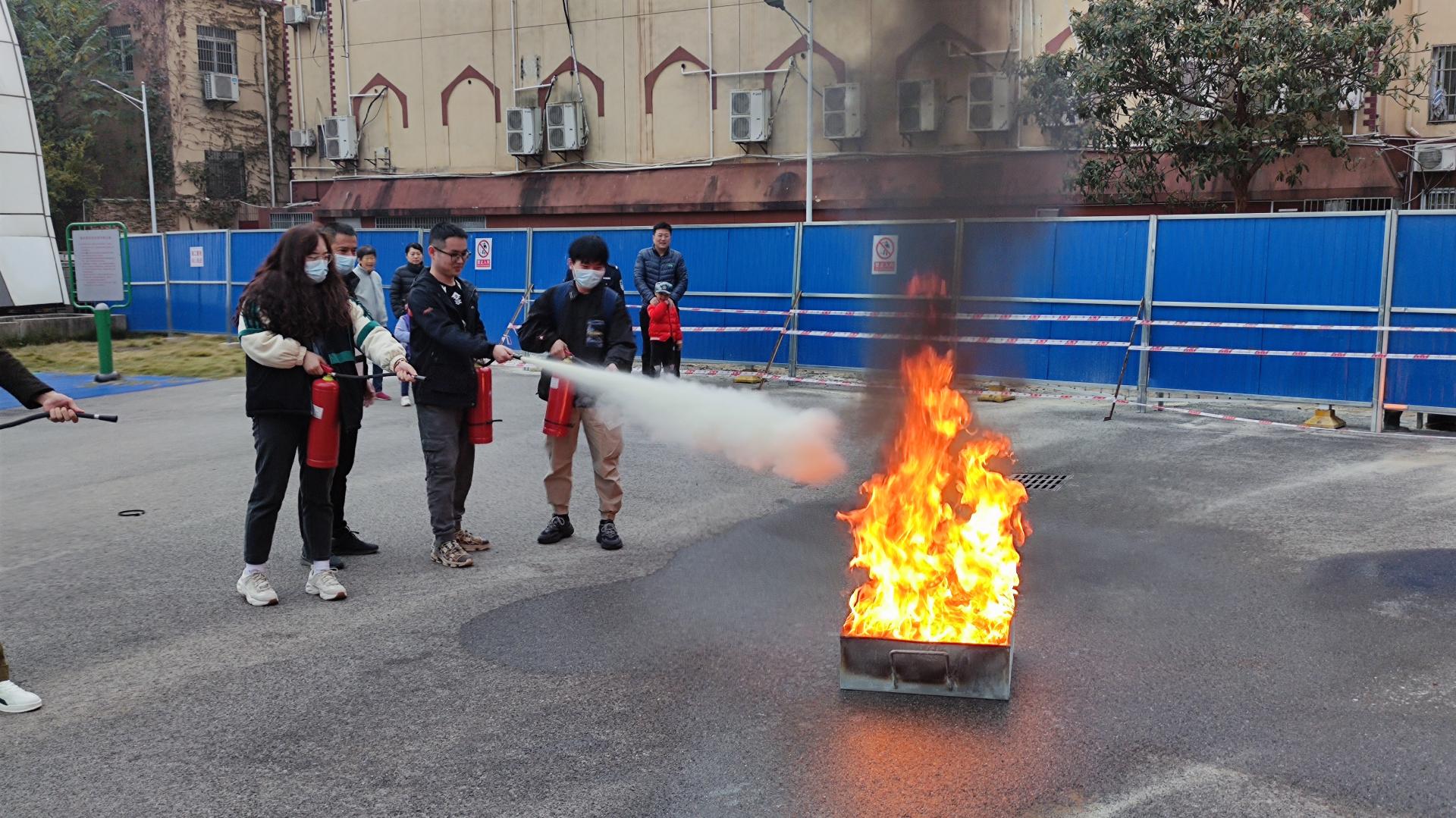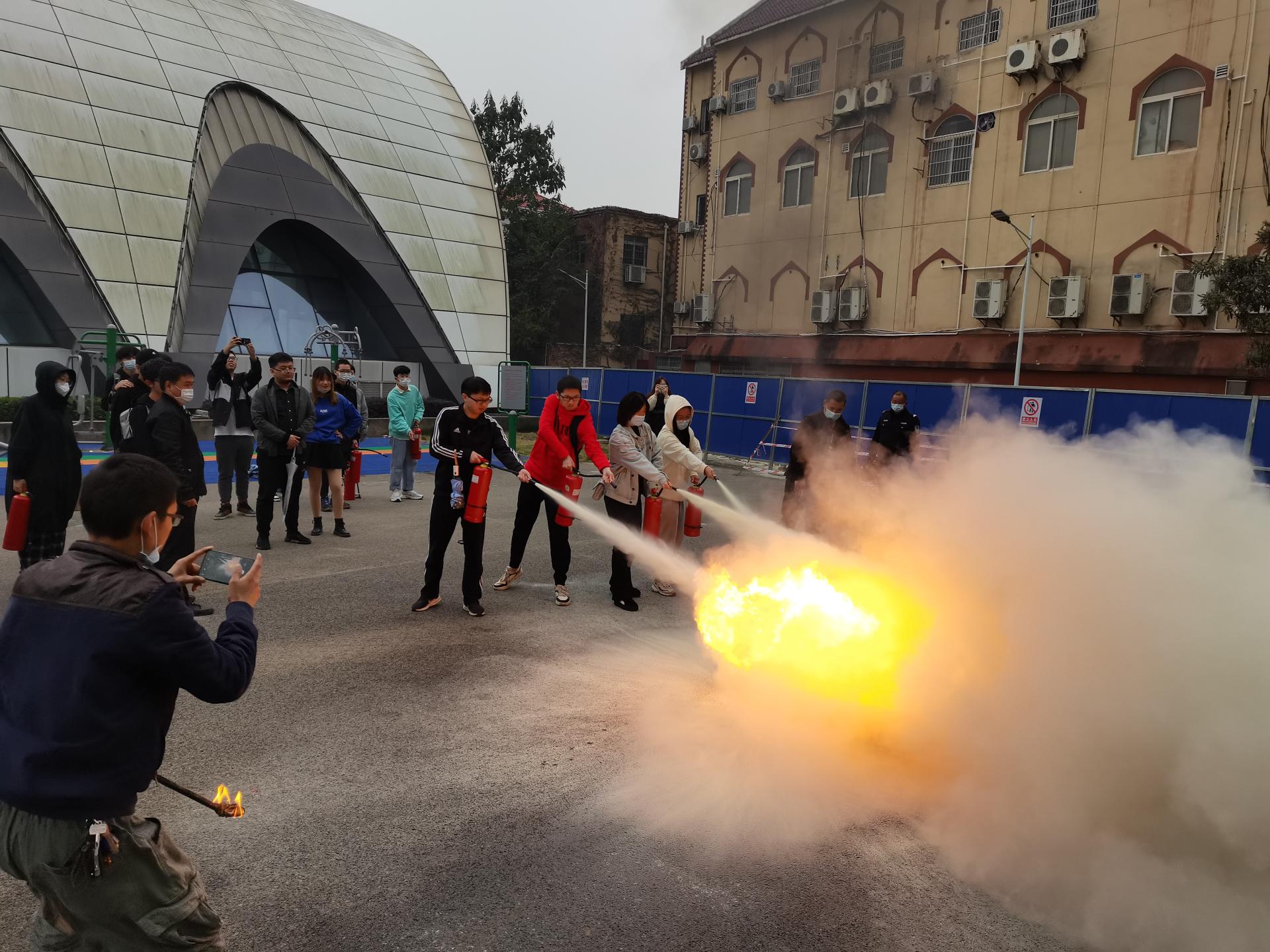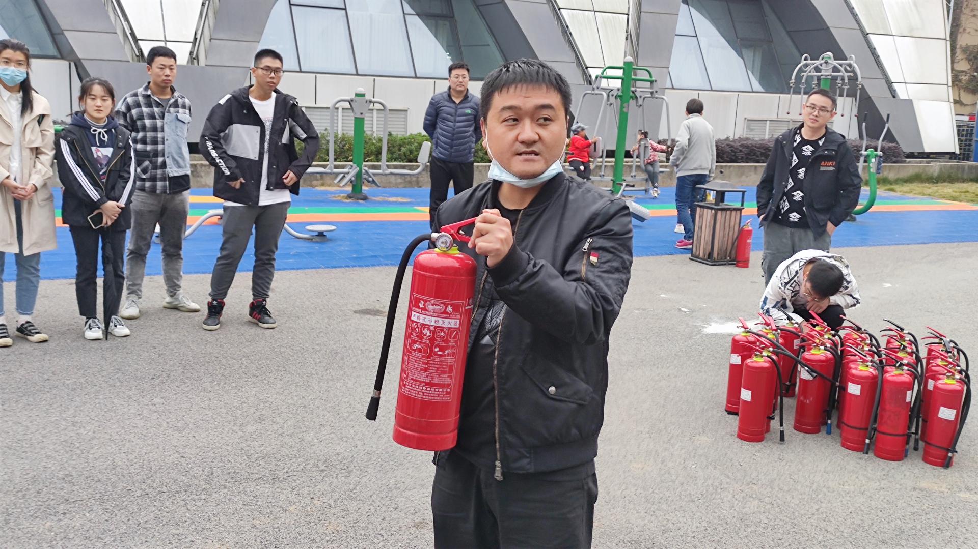 户外消防演习环节。刘老师为同学们介绍了我校常见的灭火器种类,教学了火灾现场应急处理办法、灭火器灭火原理和基本操作方法及注意事项,让同学们在校园中能正确运用相应的“武器”来对抗火灾。在讲解原理后,安全保卫部消防科的老师们带领全体在场师生参加室外消防演习活动,通过实践来巩固自身的消防意识和自救能力。