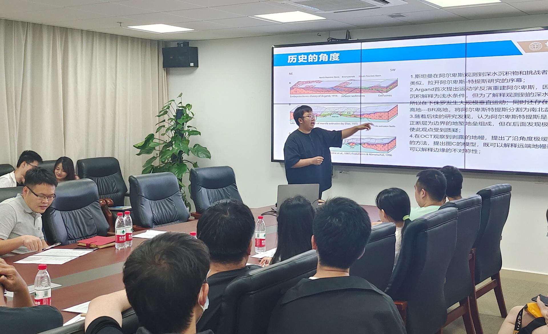 杨天一同学(2021级研究生)的汇报主题是伊比利亚-纽芬兰被动大陆边缘。与同学们交流了韧性层随深度的变化等问题。