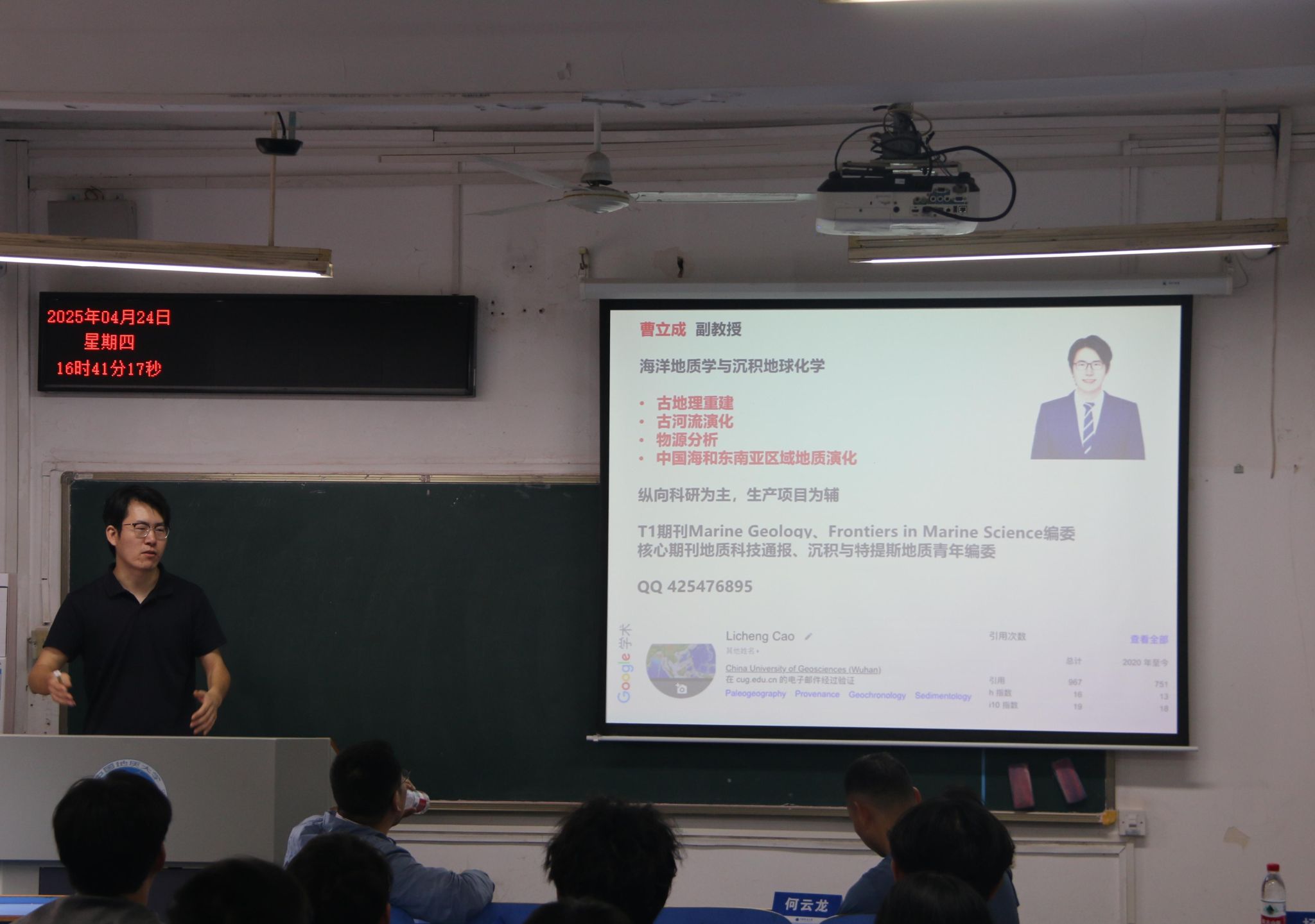 曹立成老师分享了他的研究领域——海洋地质学与沉积地球化学,主要包括河流系统物源信号传递规律、南海-东南亚地区沉积物源与古地理重建,以及基于碎屑年代学的沉积时代厘定与构造背景判别。他表示,具体的研究计划将结合学生的兴趣和专长来制定。