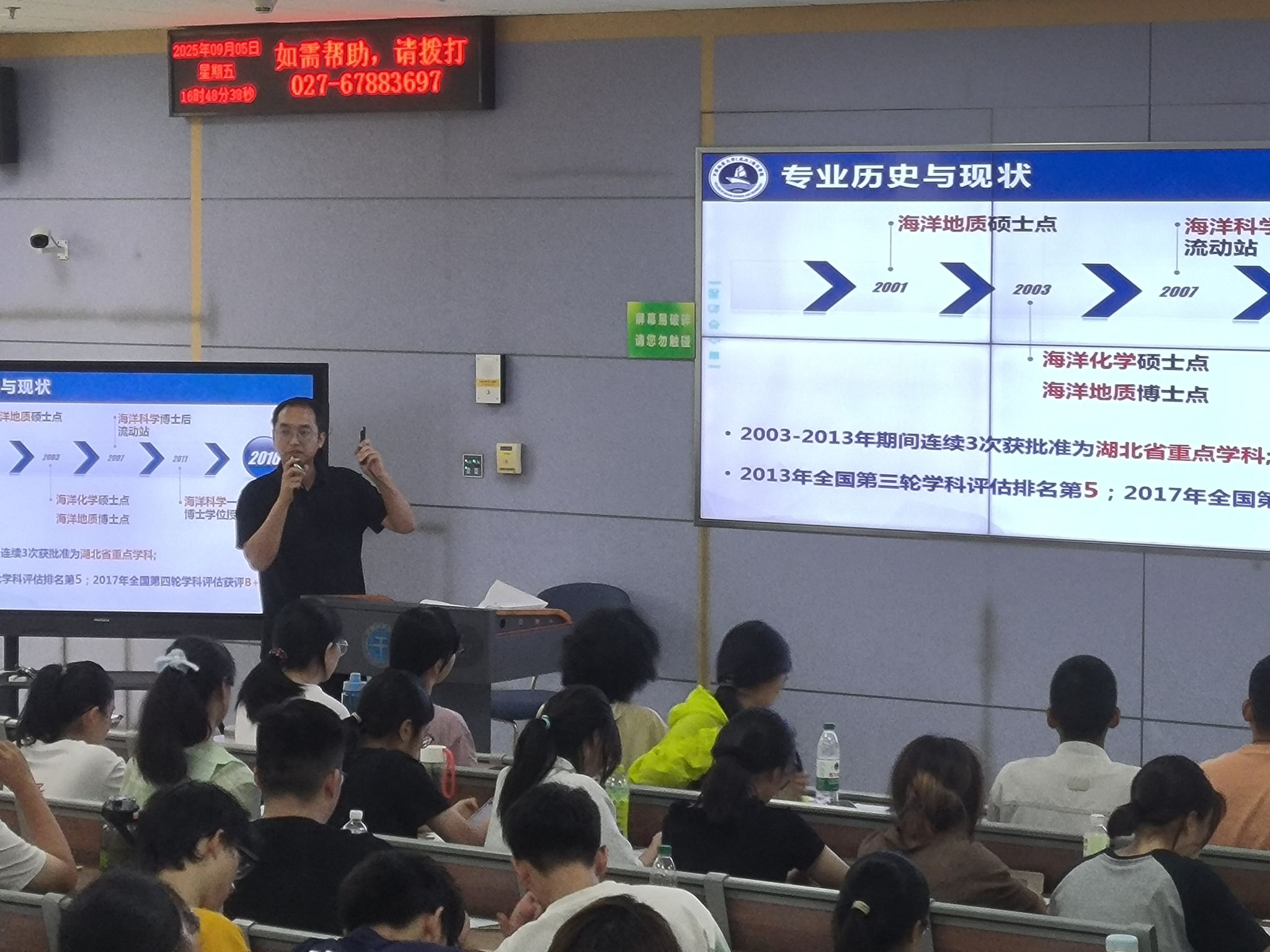 学院党委书记刘国华以《知责于心 言必守信 用好红利 行向远方》为题,提出他对新海洋学子在地大学习成长的期待,播放了纪念中国人民抗日战争暨世界反法西斯战争胜利80周年文艺晚会中的情境剧《永远的番号》、《勘探队员之歌》《周口店的那个夏天》《方向》等视频,带领同学们了解开云官网 的发展历程、学科专业与人才培养、科学研究与科研条件、重点研发团队、五大实习站点、升学和就业等内容并围绕党史、校史、院史、抗战精神等开展现场抢答活动。