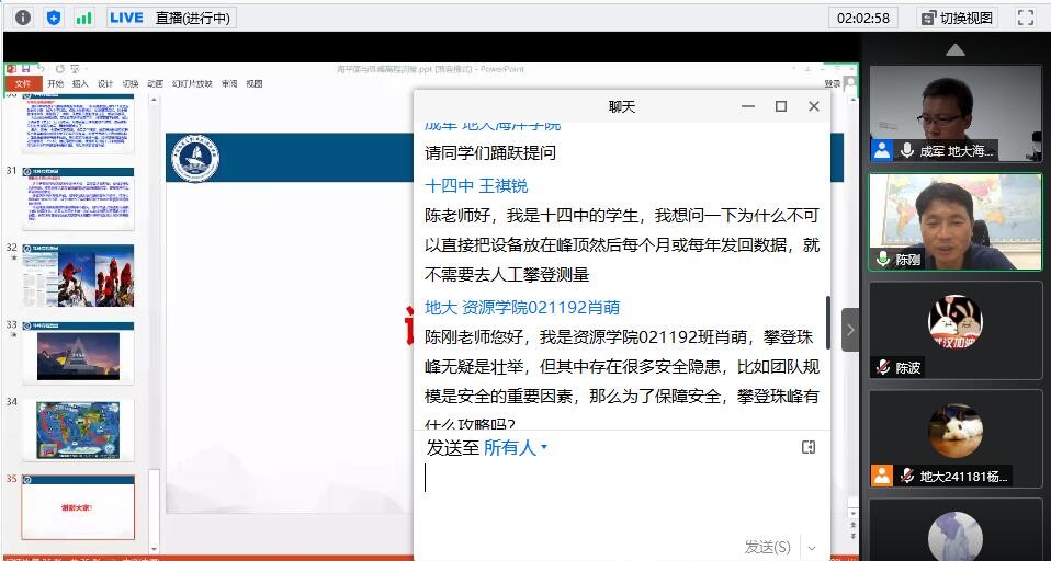 开云官网 副院长、2020年珠峰高程测量队员陈刚作“海平面与珠峰高程测量”专题讲座。陈刚老师以海洋对人类的重要性为切入点,分别从地球南北极、全球海平面变化、高程基准与海拔等方面向同学们介绍了海洋研究与珠峰研究的密切关系。结合本次珠峰高程测量的参与经历,介绍了本次珠峰高程测量的过程。讲座最后,陈刚教授与中国地质大学各学院同学、武汉市第十四中学为代表的优秀生源基地同学们就海洋与珠峰研究前沿问题进行了互动交流。