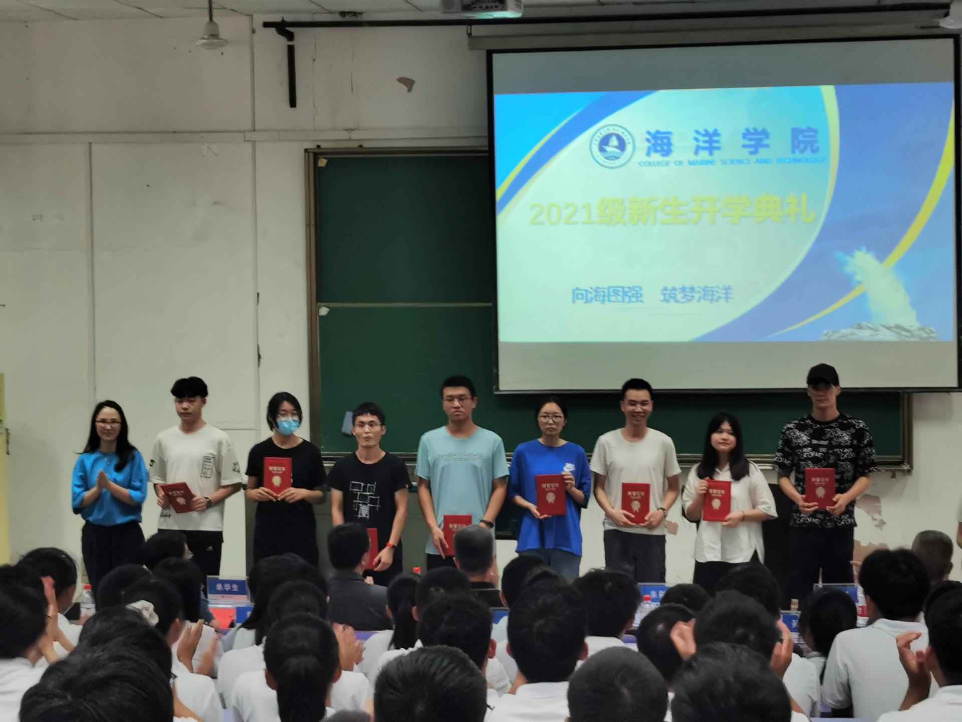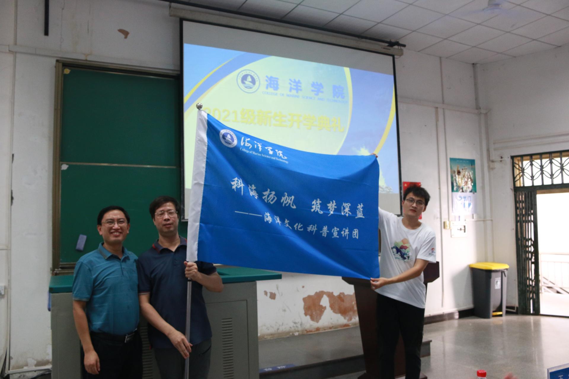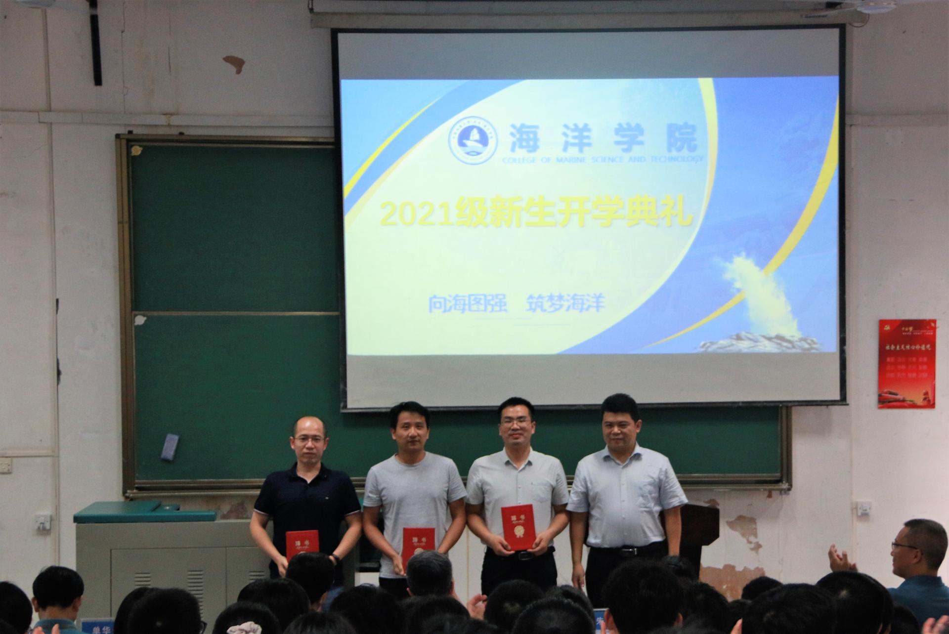 开学典礼表彰仪式上,由校团委书记朱荆萨为海洋文化节优秀营员颁发证书,科发院副院长单华生为“科海扬帆,筑梦深蓝”海洋科普宣讲团授旗,开云官网 副院长姜涛为2021级班主任颁发聘书。