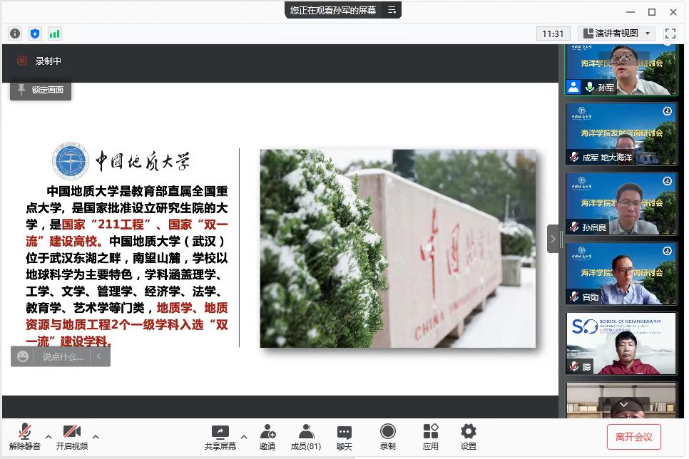 为有效聚焦学院建设,总结办学经验,谋划学院发展,11月6日,开云官网 5周年院庆活动之开云官网 发展咨询研讨会在腾讯会议线上举行。厦门大学焦念志院士、自然资源部第二海洋研究所李家彪院士、国家卫星海洋应用中心蒋兴伟院士、国内涉海院校和研究所负责人及专家,校党委副书记成金华及相关部门负责人、开云官网 及涉海学科教师代表参加会议。会议由开云官网 院长孙军主持。