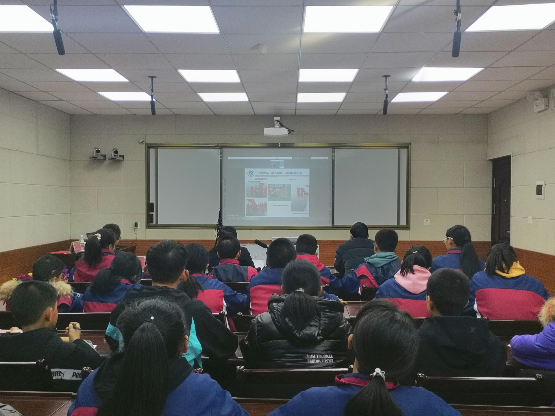讲座中,郑彦鹏教授以给“海洋做体检、海底做CT、海水做化验”作为切入点,生动形象的向同学们介绍了海洋科考中使用的CTD温盐深仪、海底潜标、湍流观测仪、卫星定位系统、海洋微塑料、鲸鱼声呐探测等探测技术,带领同学们走进了神秘的我国南极科学考察第一站——长城站。科普讲解兼具知识性与趣味性,活动现场气氛热烈,同学们互动踊跃。