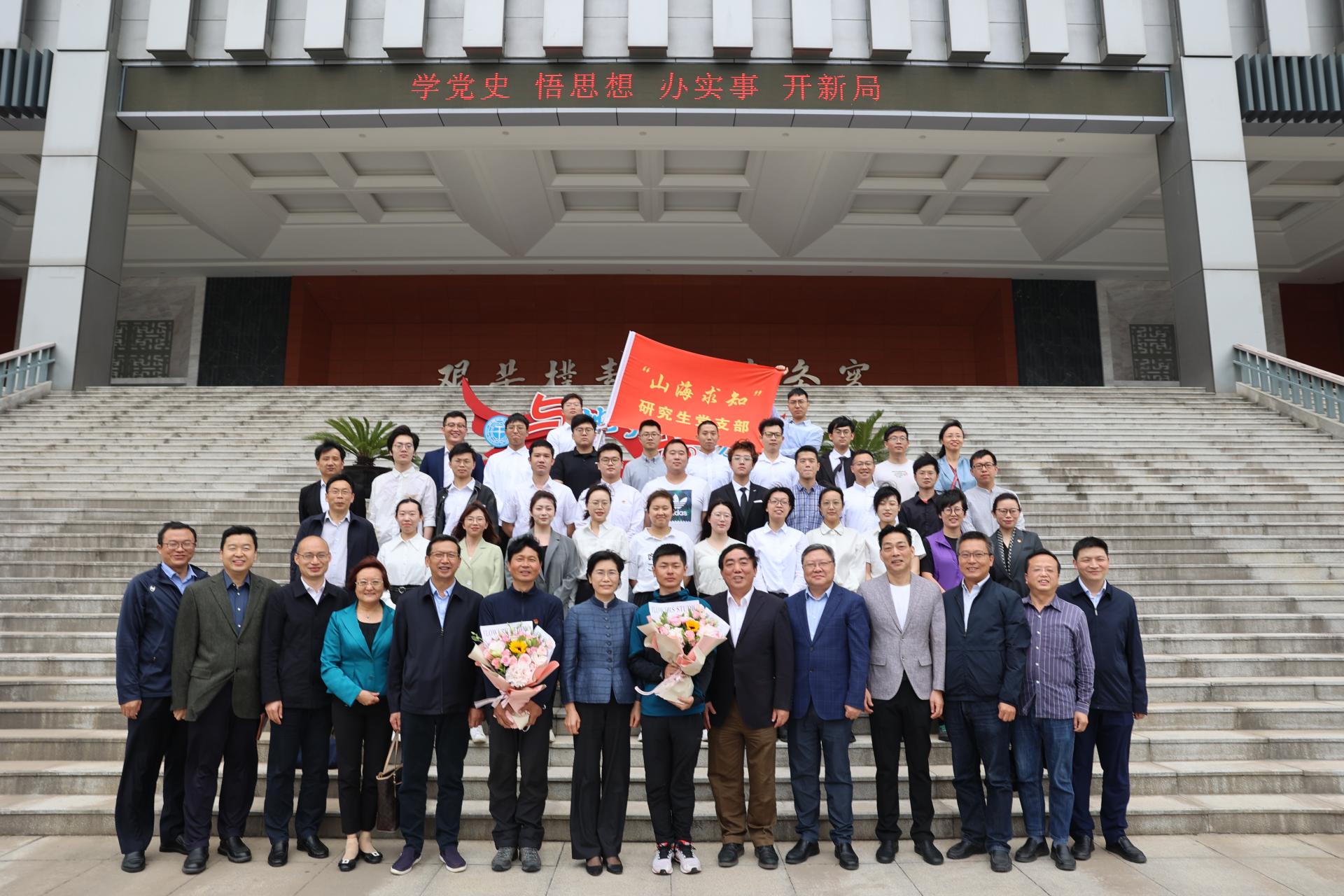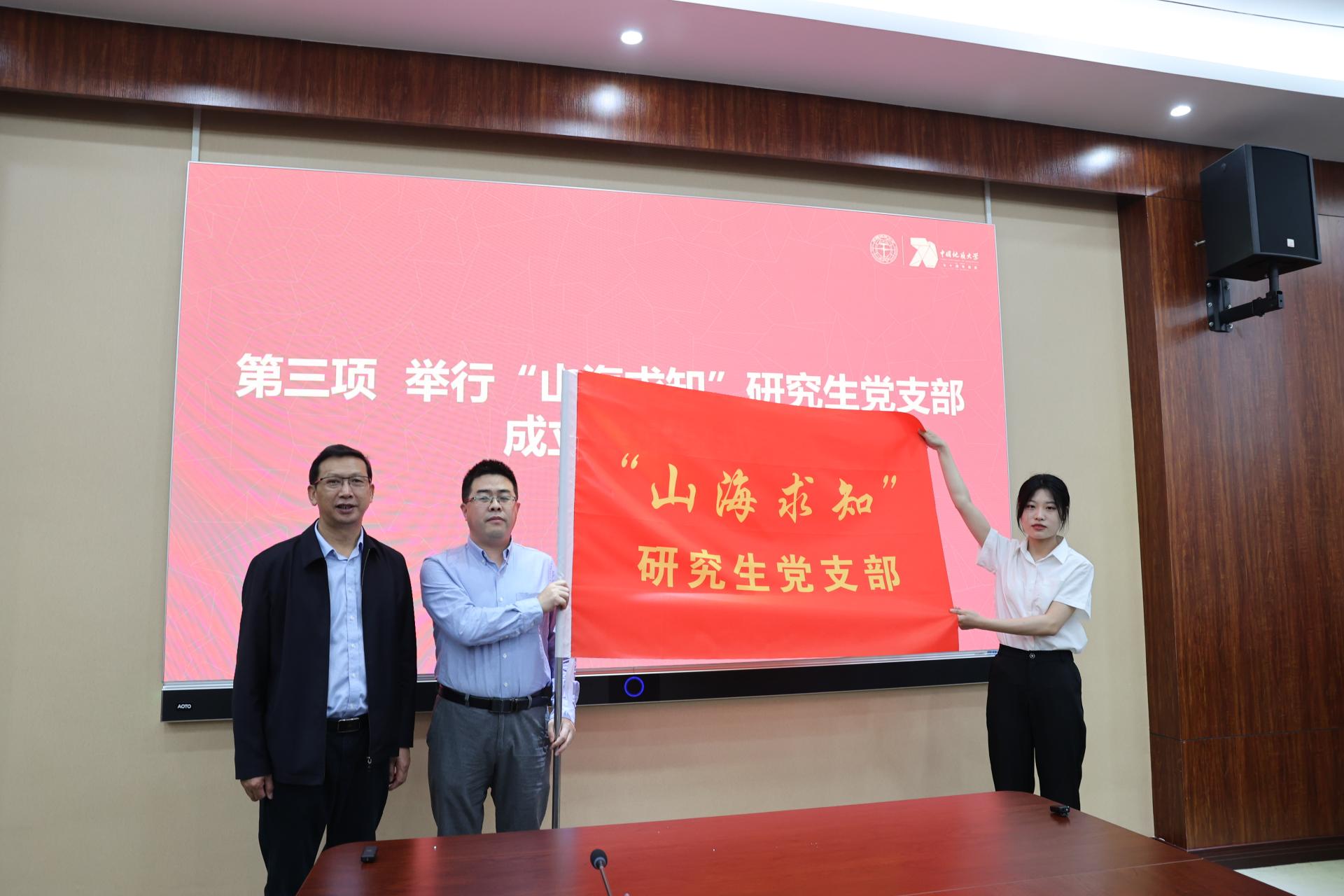 成金华为“山海求知”研究生党支部成立授旗。该研究生党支部是由陈刚教授牵头成立的纵向设置的研究生党支部,党支部将依托陈刚教授科研团队力量,夯实基层党支部建设,打造坚强战斗堡垒,促进党支部党建和科研工作的深度融合,扎实推进党建示范和质量创优工作。