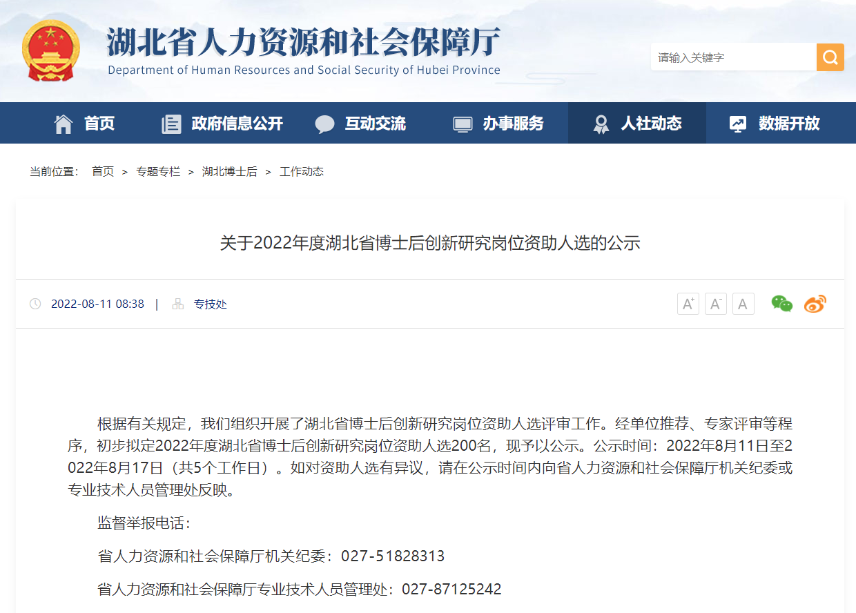 通知链接:关于2022年度湖北省博士后创新研究岗位资助人选的公示--湖北省人力资源和社会保障厅 (hubei.gov.cn)