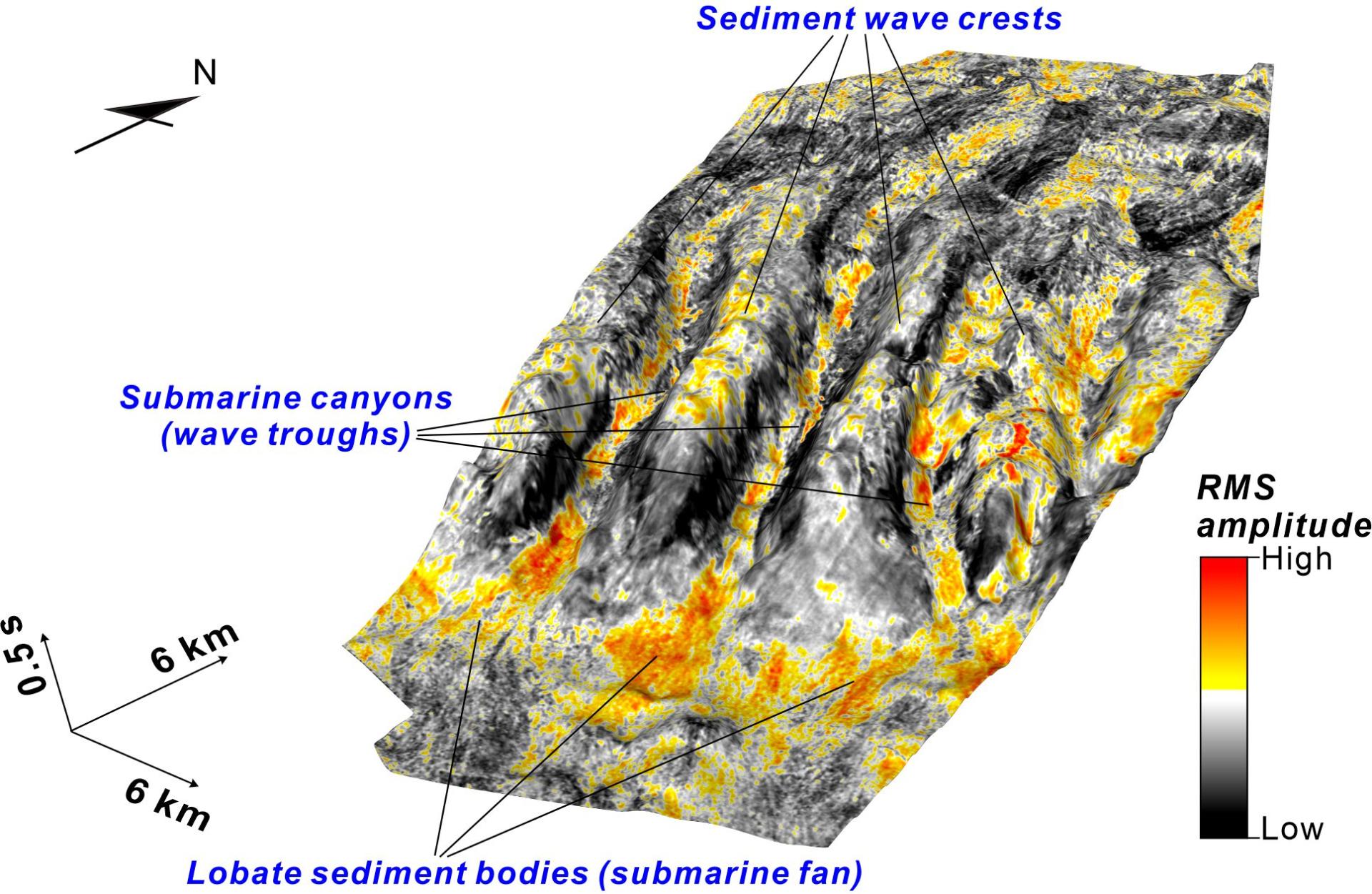 本研究利用高分辨率三维地震数据对该峡谷群开展了进一步的研究,结果表明这些峡谷主要是沿着沉积物波波谷分布。虽然海底峡谷所造成的崎岖海底会使得地震成像出现波状起伏的“假象”,但是地震相分析显示,海底无峡谷区域之下亦可见到波状起伏地貌,且这些波状起伏地貌之上可见上超、底超反射特征(1),由此表明其并非处理假象。在此基础上,综合其总体地貌特征、内部地震反射特征以及区域上存在的底流背景,本研究将这些近于等间距分布的波状起伏地貌解释为底流成因沉积物波。