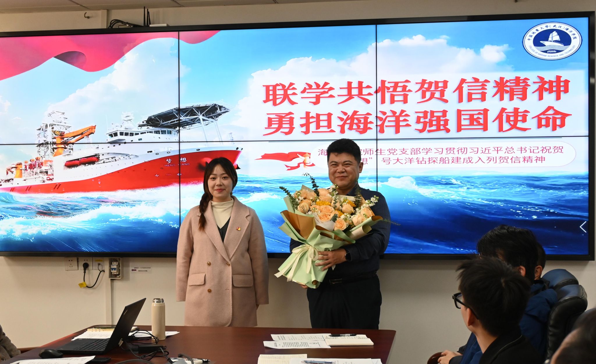 党委书记成军作总结讲话。他表示,姜涛教授全程参与“梦想”号大洋钻探船的论证、设计和建造,在“梦想”号的建成过程中发挥了举足轻重的作用。近10年来,姜涛教授作为幕后工作者,默默奉献,无私付出,彰显了作为一名优秀共产党员的躬身实干挑重担,务实笃行敢担当的卓越品质,体现了作为一名地大海洋科教工作者的坚守科技报国初心,勇担海洋强国使命的科学家精神。他强调,习总书记的贺信思想深刻、鼓舞人心,中国地质调查局的感谢信对学校表示了充分肯定,希望全院师生充分发挥地大海洋的学科优势,不断增加学科自信,开拓创新、团结协作、攻坚克难、勇攀高峰,为深海地质事业发展和学校地球科学领域建设贡献力量。