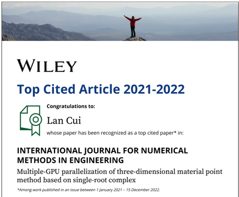 该论文题为“Multiple-GPU parallelization of three-dimensional material point method based on single-root complex”,发表于《International Journal for Numerical Methods in Engineering》2022年第123卷第6期(页码:1481-1504:DOI: 10.1002/nme.6906)。《International Journal for Numerical Methods in Engineering》由美国John Wiley & Sons出版公司出版,英国发行,是集中发表有限元方法的重要期刊。