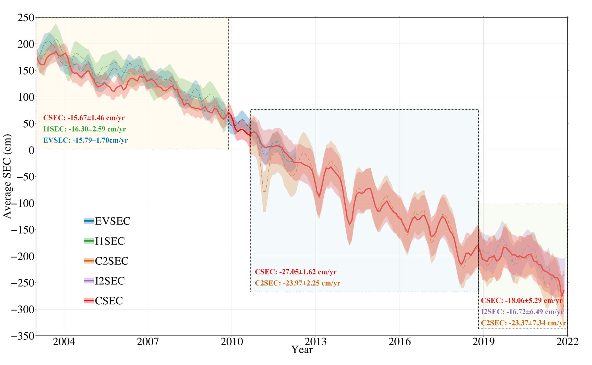随着全球气候变化频繁加剧,南极洲阿蒙森海湾(ASE)周边冰川冰架融化以及冰层变薄造成大量冰川融水流入海洋,直接导致全球海平面快速上升。因此精确量化分析该地区冰盖高程时空演变,对预测未来全球海平面变化,具有重要的科学和现实意义。考虑不同高度计任务的特点和测量精度,文中提出了一种改进的最小二乘平面拟合方法(ILSPFM),实现多任务雷达和激光卫星测高数据的融合。利用Envisat、ICESat、ICESat-2和CryoSat-2观测数据,重建了2003-2021年阿蒙森海冰流域冰盖表面高程月变化记录。改进方法得到的融合质量变化结果相较于单一卫星数据的简单组合,均方根误差减少了25%,并与IceBridge机载激光测高和GRACE Mascon产品保持了良好的时空一致性。