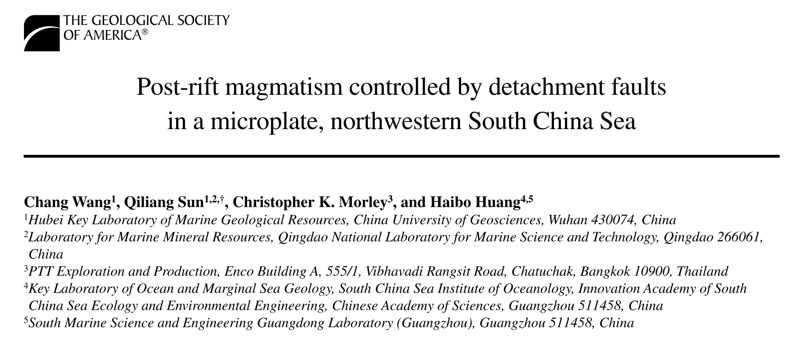 Wang, C., Sun, Q., Morley, C. K., and Huang, H., 2023, Post-rift magmatism controlled by detachment faults in a microplate, northwestern South China Sea: Geological Society of America Bulletin, //doi.org/10.1130/B36981.1