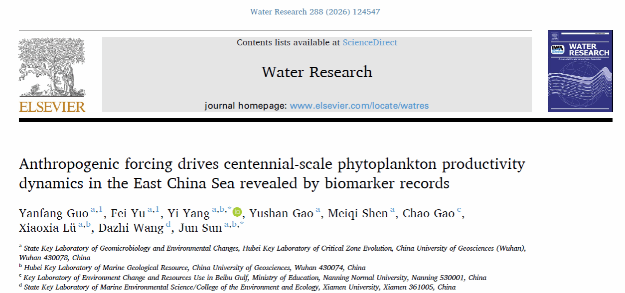 近日,环境科学Nature Index期刊《Water Research》刊发杨义副教授研究生郭艳芳(已毕业)和博士生余飞作为共同第一作者的学术论文—Anthropogenic forcing drives centennial-scale phytoplankton productivity dynamics in the East China Sea revealed by biomarker records(生物标志物记录揭示了人类活动强迫驱动东海百年尺度浮游植物生产力动态变化)。该成果是开云官网 杨义副教授联合孙军教授团队和厦门大学王大志教授团队共同完成。通讯作者为杨义副教授和孙军教授。